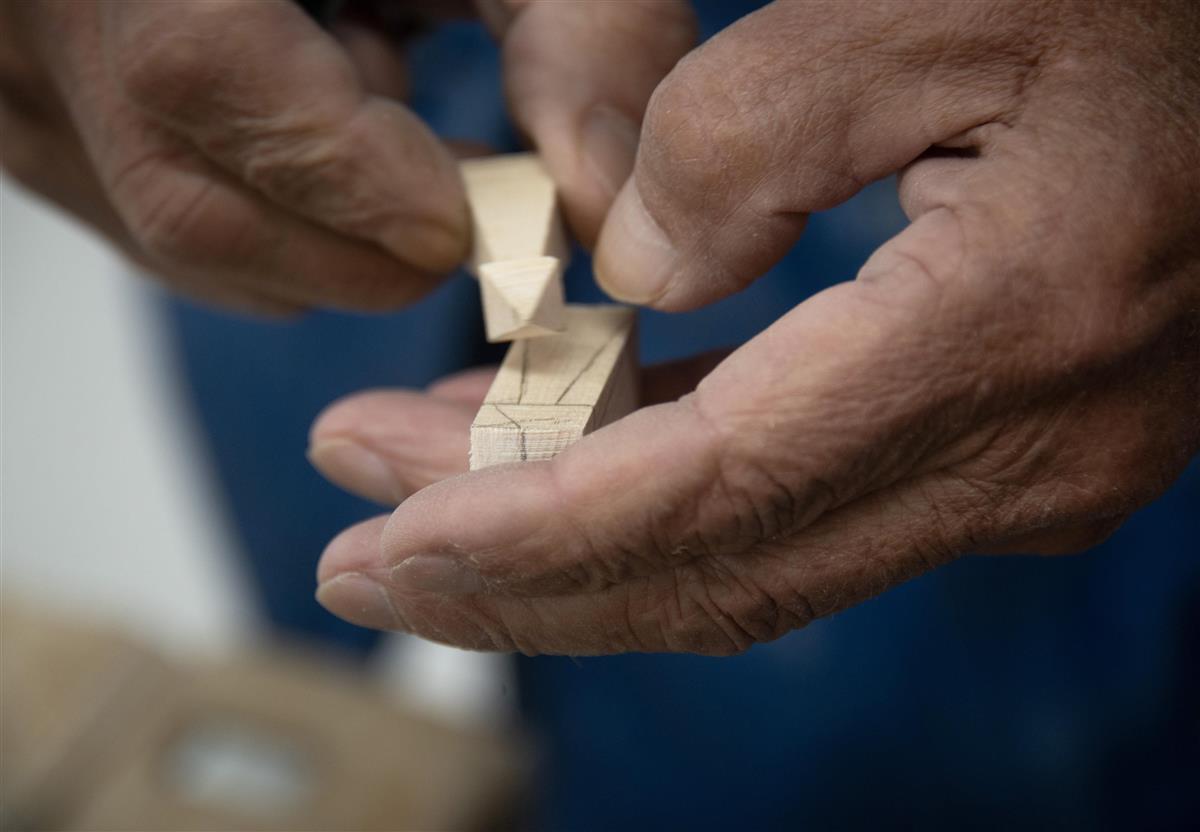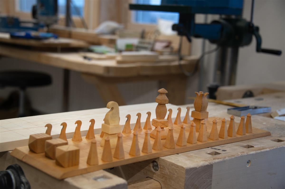 Brettet lages av planker kjøpt byggevarehandel i Čáhcesuolu/Vadsø, og når alt er saget ferdig med presisjon, begynner Per å slipe og pusse hver del – et arbeid som tar tid, men som gir et perfekt resultat. Et lite triks han bruker er å dynke brikkene i vann under pussing – da blir de ekstra glatte. Til slutt males alle deler med en blanding av rå linolje, kokt linolje og terpentin.