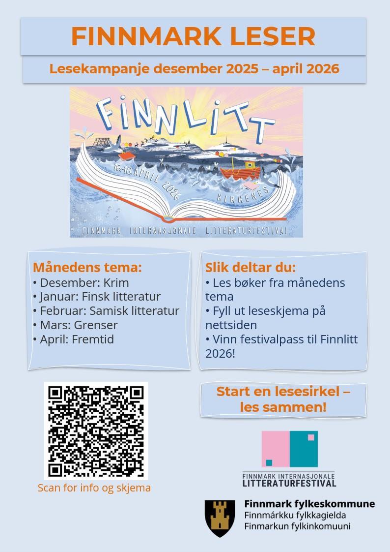 Deltakere fyller ut og sender inn digitalt lesekjema og blir hver måned med i trekningen av et festivalpass til Finnlitt 26. Deltakerne får tilgang til nettsiden og digitalt skjema ved å scanne qr-kode på plakaten, eller trykker på lenken dere deler.